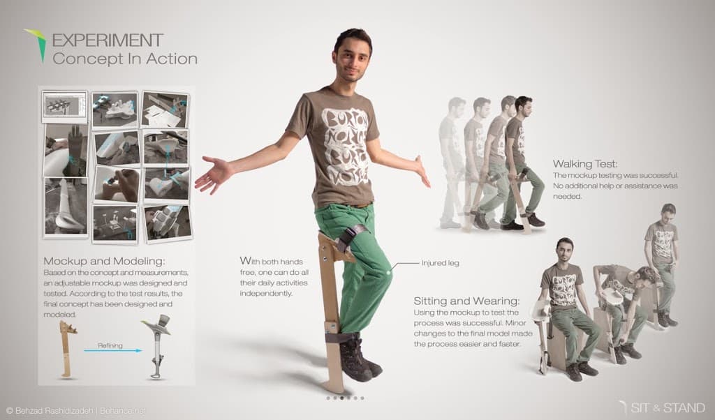 Aux Etats-unis, au college for creative studies de Détroit, un étudiant de 27 ans, Behzad Rashidizadeh, a élaboré un concept de béquille mains-libres » sit & stand « .