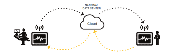 Le relevé des ECG s’effectue via des capteurs sans fils, positionnées sur les patients. Le relevé est visible sur la tablette, puis envoyé via le réseau cellulaire et stocké sur des serveurs nationaux.