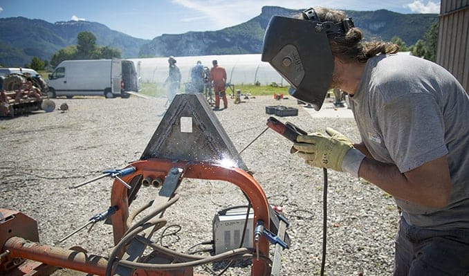 En France, dans le département de l’Isère, la coopérative L’Atelier paysan propose aux agriculteurs de fabriquer et d’équiper leurs outils agricoles avec un triangle d’attelage.