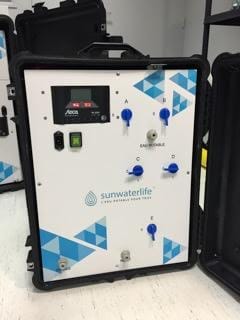 Le système Aqualink de Sunwaterlife se présente sous la forme d’une valise. Pesant une vingtaine de kilos, le transport de celles-ci et leur déploiement sont facilités. L’alimentation électrique est fournie par les 6 panneaux solaires ☀ dépliables chargeant la batterie délivrant la puissance nécessaire à son fonctionnement. Quelle que soit la source d’eau pompée, l’eau en sortie est de suite potable. Le rendement de la valise « version trip » permet de fournir 800 litres d’eau potable par jour la « version UF » 3000 litres par jour. Cinq litres d’eau potable par jour et par personne permettent de couvrir les besoins vitaux, cependant l’OMS indique qu’un minimum de 20 litres d’eau non souillée est nécessaire. Une seule valise permet donc de subvenir aux besoins a minima de 160 personnes. La filtration est certifiée ACF et NSF-ANSI avec une finesse de filtration de l’ordre de 0,0001 micron par osmose inverse et de 0,01 micron pour la version UF par ultrafiltration. Les différents germes, parasites et virus responsables des maladies telles que la polio, le choléra, les hépatites, les gastro-entérites sont éliminés.