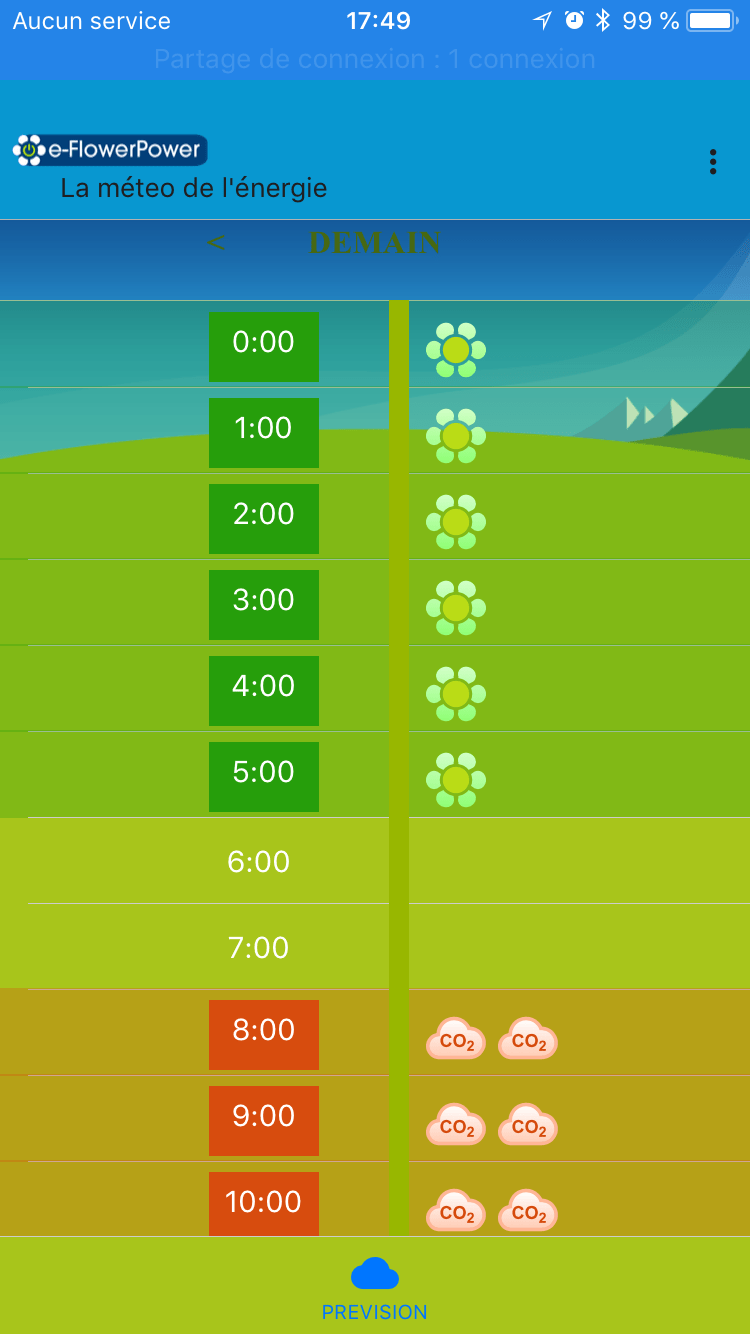 Le comportement des consommateurs est un levier majeur de la transition énergétique. En modifiant nos modes de consommation, nous avons un impact sur la sollicitation des infrastructures. e-FlowerPower l’a bien compris et incite à une consommation plus raisonnée. Elle cherche à réaliser un doublé avec une prise de conscience de la population sur son impact environnemental. En effet, aux heures où la demande est forte, des centrales à fioul, gaz ou charbon sont sollicitées pour fournir le surplus d’électricité nécessaire. A contrario, sur certaines plages horaires, la production supplémentaire issue des énergies renouvelables, telles que l’éolien🌬, le solaire ou l’hydraulique, permet de satisfaire nos besoins. Pour ce faire, Marc Schicks, un des fondateurs de cette jeune société, a développé un algorithme permettant d’effectuer des prévisions dans la production d’électricité des prochaines 24 heures. D’ailleurs, l’application se base principalement sur des données issues de l’Open data du réseau de transport de l’électricité (RTE). Côté utilisateur, l’application pour smartphones se veut aussi simple d’utilisation qu’efficace. Celle-ci est disponible sur iOS et Androïd. Ainsi, des fleurs sur fond vert indiquent les heures les plus vertes. par contre, des nuages estampillés « CO2 » sur fond rouge indiquent celles les plus polluantes.