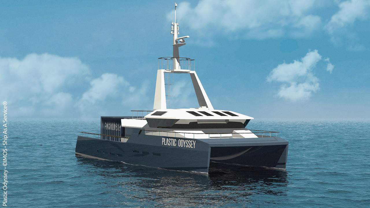 Pour voguer sur les flots, le catamaran océanographique Plastic Odyssey, spécialement conçu par IMOS et exploité par la société ship-as-a-service, sera affrété par Plastic Odyssey le temps de l’expédition. Il sera éco-désigné et fabriqué en France 🇫🇷. Selon l’équipe de Plastic Odyssey, ce navire sera un ambassadeur des technologies de recyclage. Il effectuera trente-trois escales pendant ses trois années de navigation. Il visitera les villes portuaires de Marseille, de Casablanca au Maroc 🇲🇦, Dakar au Sénégal 🇸🇳. De Freetown en Sierra Leone 🇸🇱, il rejoindra le Brésil 🇧🇷 à Natal puis remontera ses côtes en direction du canal de Panama 🇵🇦 qu’il traversera pour rejoindre Lima au Pérou 🇵🇪. La traversée du Pacifique les mèneront en Océanie et en Asie, où ils feront escale à Papeete en Polynésie Française, pour ensuite rejoindre Madang en Papouasie Nouvelle-Guinée, la Chine 🇨🇳 à Shantou. Enfin, ils passeront par L’inde 🇮🇳 pour rejoindre Le Cap en Afrique du Sud 🇿🇦 et longer les côtes africaines en direction de Marseille en France 🇫🇷. En préambule à l’expédition, pour en assurer la promotion, un bateau démonstrateur, baptisé Ulysse, long de six mètres a été assemblé dans la base Explore du navigateur Roland Jourdain à Concarneau. Ce dernier est exposé depuis juin 2018 dans plusieurs villes de France lors d’événements nautiques et écologiques. Ce prototype est une première mondiale et a suscité beaucoup d’intérêt. À Monaco 🇲🇨 , lors d’une rencontre nautique, en juillet 2018, la Solar & Energy Boat Challenge, la jeune équipe naviguait au milieu de bateaux solaires. À terme, Le catamaran Plastic Odyssey sera un concentré de technologie et d’innovations. Un routage météorologique lui permettra d’utiliser les voies de navigation les plus économes. Sa coque profilée, son système de contrôle de l’énergie et ses panneaux solaires lui assureront une autonomie hors-normes. L’espace en son sein est modulable. En mer l’équipage pourra y prendre ses quartiers. Le temps d’une escale cet espace sera transformé en atelier de recyclage des déchets plastiques.
