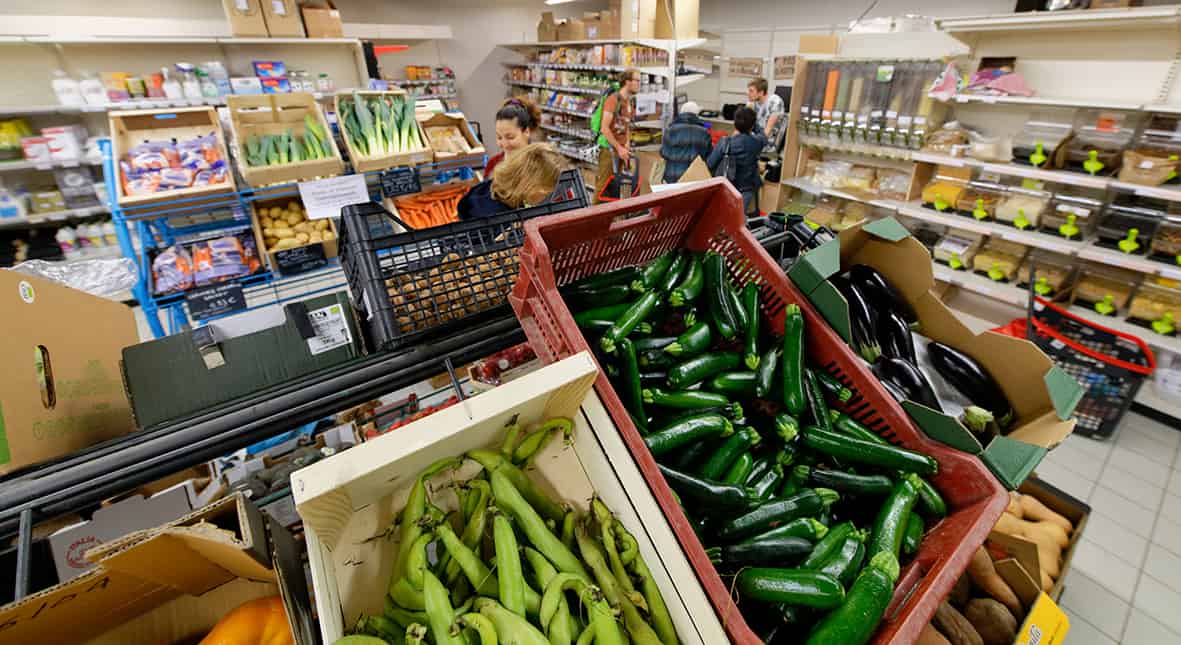 En France, à Montpellier, le supermarché coopératif, participatif et à but non lucratif La Cagette propose une alternative à la grande distribution.