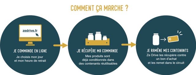 Depuis janvier 2019, les deux co-fondatrices mènent leur projet de drive zéro déchet tambour battant. Avec l’accompagnement d’Eticoop et une incubation réussie, fin 2019, ZeDrive est sur le chemin de la réalisation. Le bail du local est signé par suite de l’obtention du prêt bancaire. Dans le même temps la création de la SAS dans le domaine de l’économie sociale et solidaire (ESS) permet d’identifier la nature responsable du projet. En effet, différents critères devront être respectés pour garantir cette classification. Le concept paraît simple sur le papier. Cependant, c’est une véritable logistique qu’il faut mettre en œuvre pour faire le lien entre les différents acteurs, du producteur local au consommateur responsable. ZeDrive envisage de combiner une épicerie vrac, un magasin bio et offrir les services d’un drive à destination des locavores. Les denrées sont conditionnées dans des contenants réutilisables qui sont rapportés à la prochaine visite. ZeDrive applique la consigne inversée. Des bons d’achat sont distribués en échange du retour des contenants. Ils seront alors nettoyés et pour offrir leurs bons et loyaux services à d’autres clients. ZeDrive indique que cela consomme quatre fois moins de ressources et d’énergies qu’un emballage recyclé.